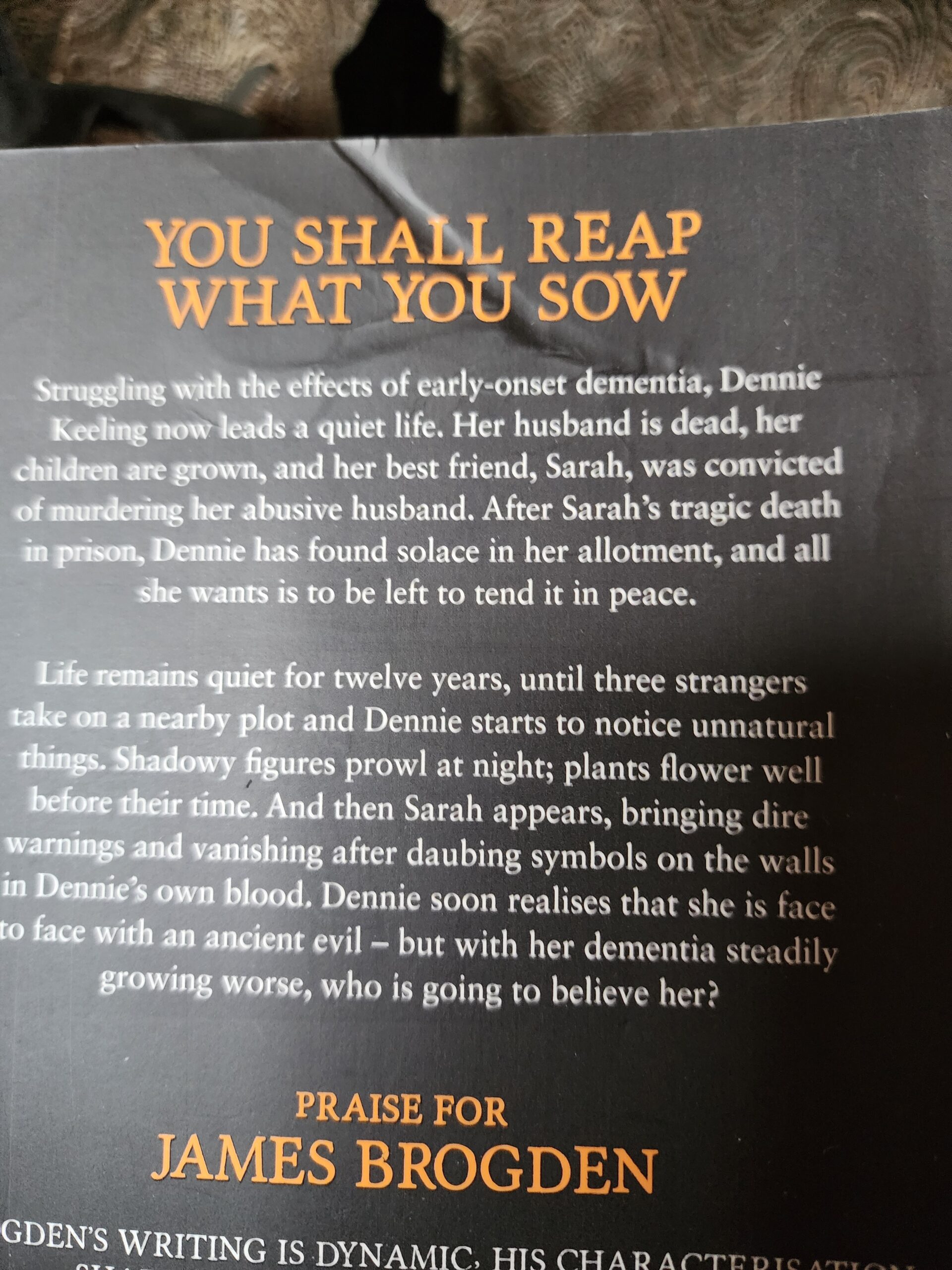 Struggling with the effects of early-onset dementia, Dennie Keeling now leads a quiet life. Her husband is dead, her children are grown, and her best friend, Sarah, was convicted of murdering her abusive husband. After Sarah’s tragic death in prison, Dennie has found solace in her allotment, and all she wants is to be left to tend it in peace. Life remains quiet for twelve years, until three strangers take on a nearby plot and Dennie starts to notice unnatural things. Shadowy figures prowl at night; plants flower well before their time. And then Sarah appears, bringing dire warnings and vanishing after daubing symbols on the walls in Dennie’s own blood. Dennie soon realises that she is face to face with an ancient evil – but with her dementia steadily growing worse, who is going to believe her?